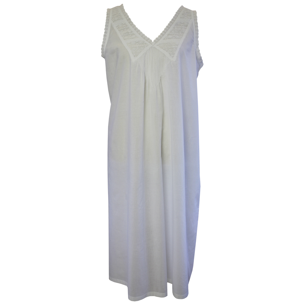 Jane is een mooi mouwloos katoenen nachthemd met prachtig borduurwerk en sierlijke plooitjes. Jane is een elegant en nonchalant nachthemd dat teruggrijpt naar de stijl van de jaren 30. Dit model is mouwloos en valt onder de knie.