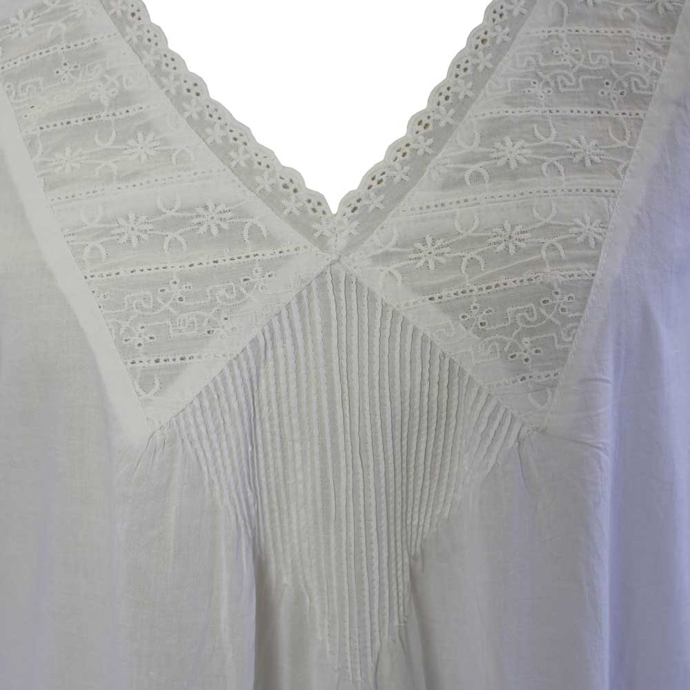 De V-vormige halslijn en mouwen zijn afgezet met smalle broderie anglaise. Onder de halslijn bevinden zich puntige kraagvormige pandjes met wit borduurwerk en zeer fijne plooitjes die zorgen voor die perfecte vintage look.