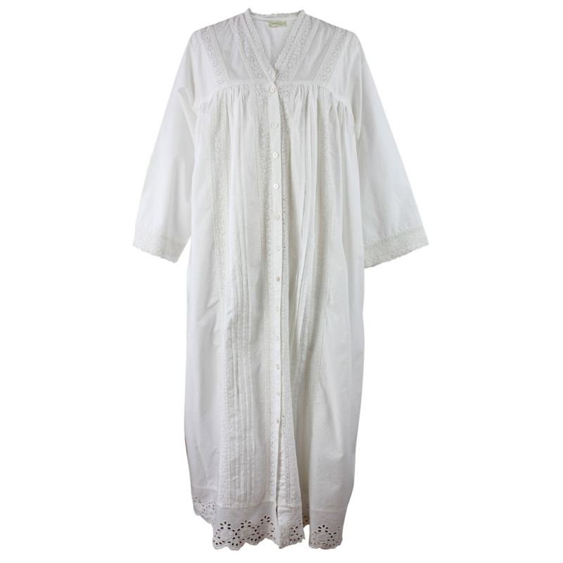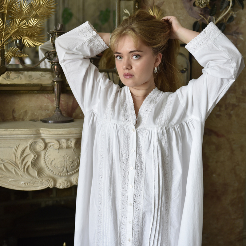 Doordat het prachtige nachthemd Claudia een knoopsluiting heeft over de gehele lengte kan deze ook als kamerjas gebruikt worden. Het nachthemd is met lange mouwen en een prachtige katoenen kanten rand die over de hele lengte van het nachthemd/kamerjas loopt, met speldenplooien en parelmoeren knopen van de onderkant van de V-hals tot aan de zoom. De zoom heeft een prachtige brede katoenen kanten rand en de manchetten zijn afgezet met fijner katoenen kant.