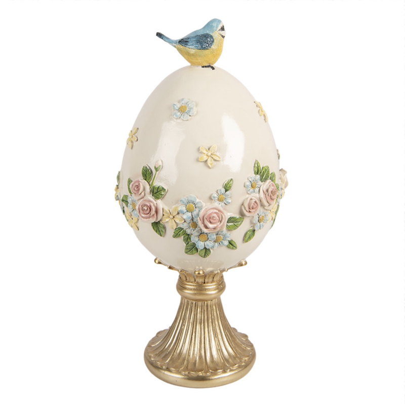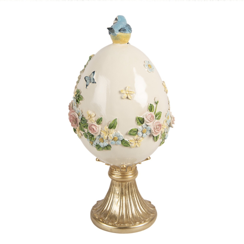 Een prachtige decoratie voor Pasen of lente deze eivorm met beige als hoofdkleur en daarop mooie roosjes, bloemetjes en vlinders. Bovenop het ei vind je een vogel!