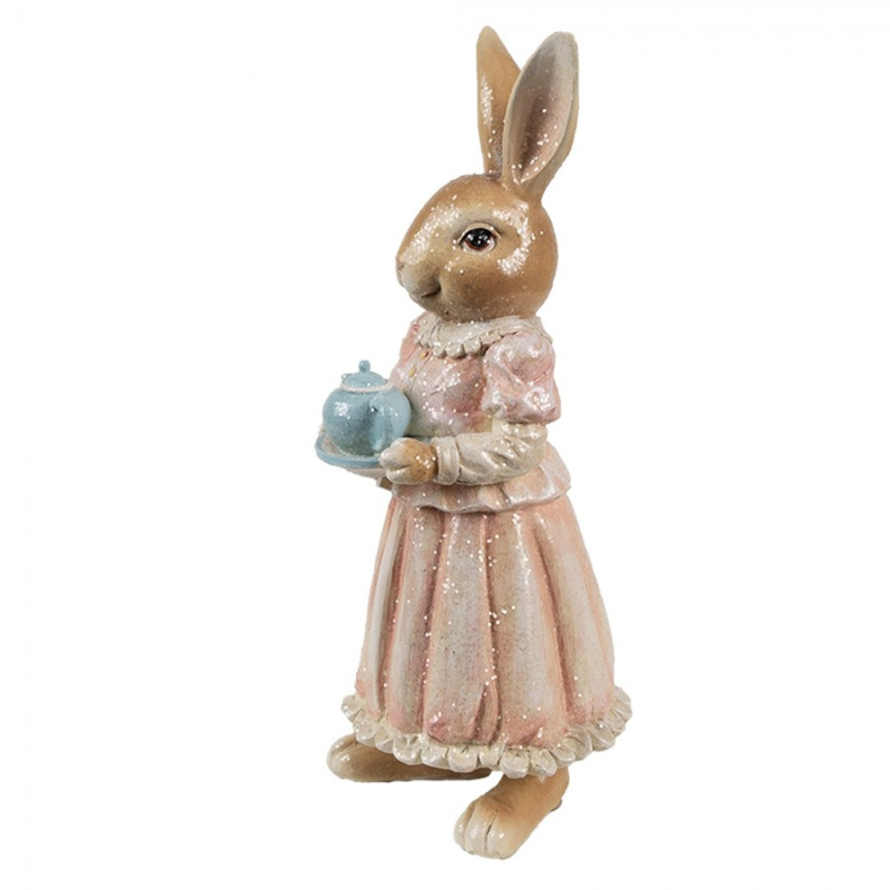 Een schattige decoratie dit beeld van een vrouwelijk konijn met een mooie roze jurk met kantjes aan en in haar handen een blauwe theepot!