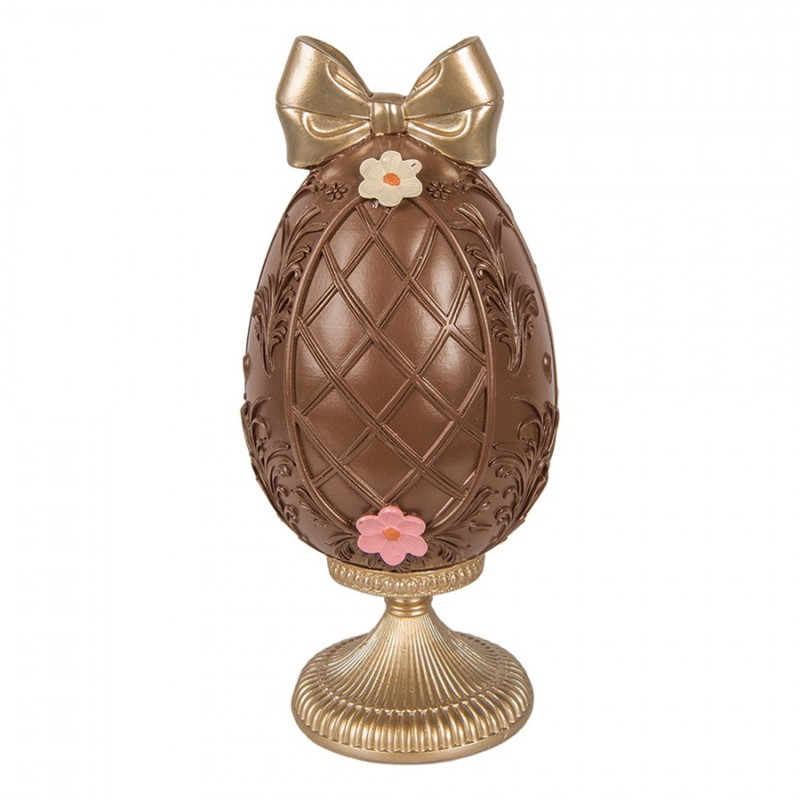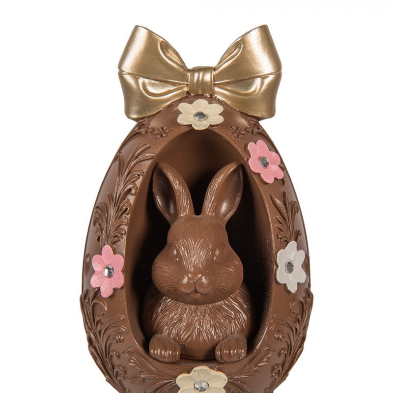 Dit prachtige decoratie ei in een chocolade bruine kleur zit vast op de goudkleurige staander. In het ei vind je een schattig konijn! Verder is het ei afgewerkt met een goudkleurige strik en roze en witte bloemetjes!