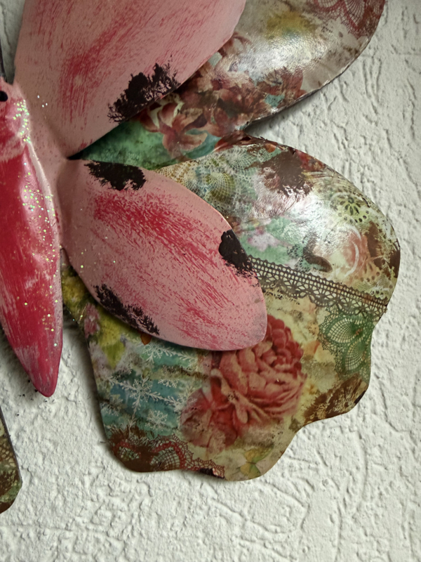 Prachtige ijzeren vlinder in roze tinten, de vlinder heeft een vintage rozenpatroon op de vleugels. De vlinder is "oud gemaakt" en heeft 2 ijzeren voelsprieten.