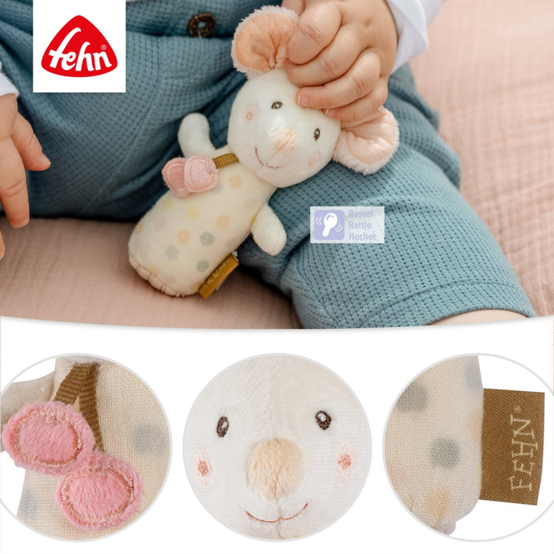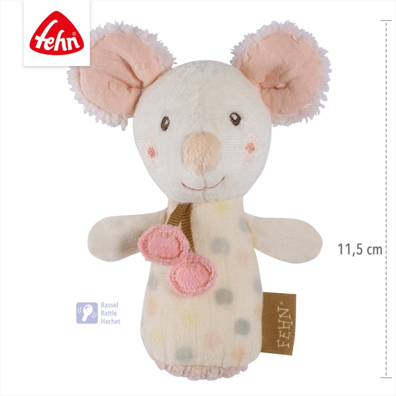 De rammelaar is gemaakt van een zachte stof in de vorm van een snoezige muis. Doordat de rammelaar kan worden vastgepakt, gevoeld en er mee gerammeld kan worden wordt daardoor de interesse van baby van 0+ gestimuleerd en wordt de baby uitgenodigd om te ontdekken en te verkennen. Het kleine speeldiertje bevordert op speelse wijze het gehoor, het grijpen, de tastzin en de fijne motoriek van de allerkleinsten.