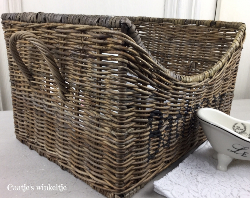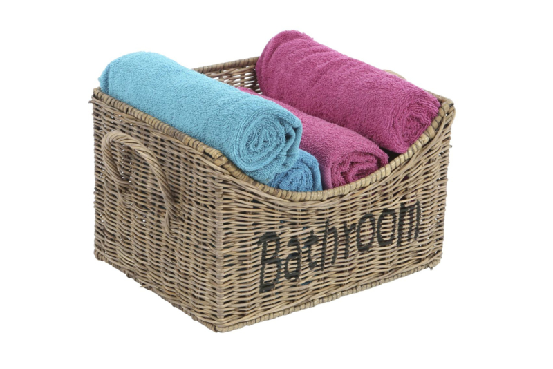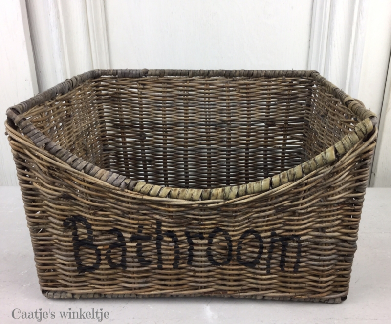 Deze rotan/rieten mand staat geweldig in een landelijke badkamer! Op de voorzijde staat in zwarte letters Bathroom en aan beide zijde bevind zich een handvat. Apart aan deze mand is dat hij aan de voorzijde afloopt. Handig voor hand/gastendoekjes of andere badspulletjes in op te bergen!