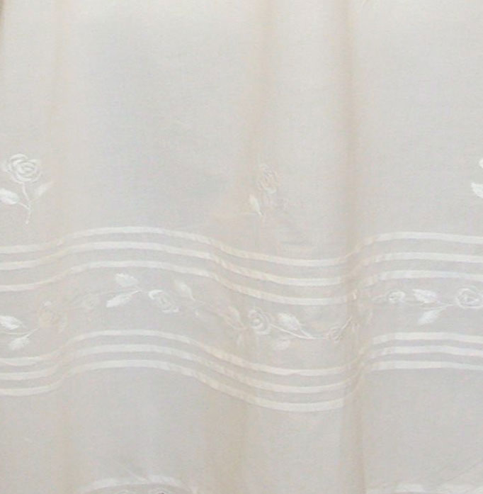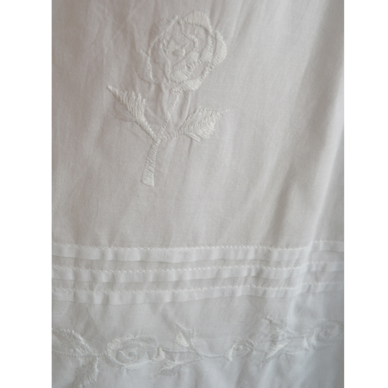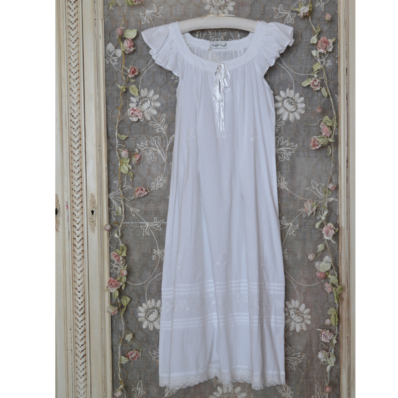 Mooi nachthemd met geborduurde rozen, kapmouwtjes en een fraaie halslijn die door middel van een wit lint aangetrokken kan worden. Aan de onderkant bevinden zich stroken en is het geheel afgewerkt met een kant.