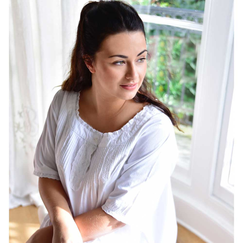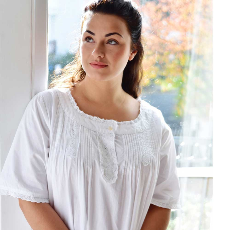 Prachtig romantisch nachthemd met korte mouwen en een mooie ronde halslijn. Aan de bovenkant zitten kleine plooitjes en is afgewerkt met romantische broderie. Het nachthemd heeft een splitje wat sluit met een klein lief parelmoer knoopje. Ook de halslijn en mouwen zijn afgewerkt met broderie.