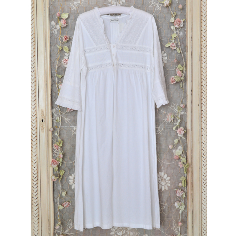 Prachtig wit nachthemd met driekwart mouwen, zeer mooi afgewerkt met broderie en zigzag band, sluit met een blinde knoopsluiting.