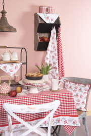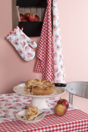 Gemaakt van mooie katoenen stoffen met een frisse print van appels gecombineerd met een rode landelijke ruit! Sommige artikelen van deze serie zijn afgewerkt met een rode band of een band met kleine pomponnetjes.