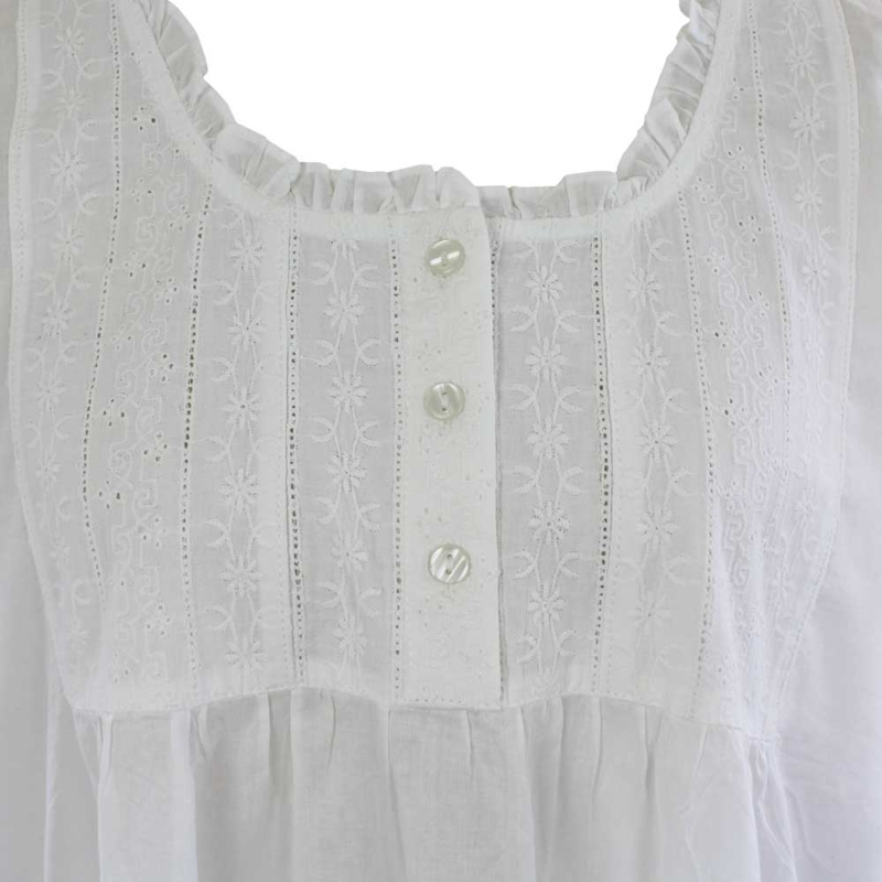 Het nachthemd heeft een geborduurd voorpand met 3 mooie parelmoer knoopjes, ook de korte mouw is van broderie. Hals en mouwen zijn afgewerkt met een fijne ruche.