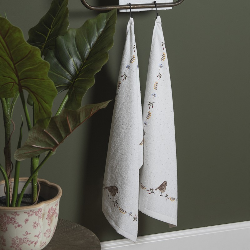 Mooi en handig gastendoekje met een leuke print van een schattig vogeltje en een rand met takjesmotief.