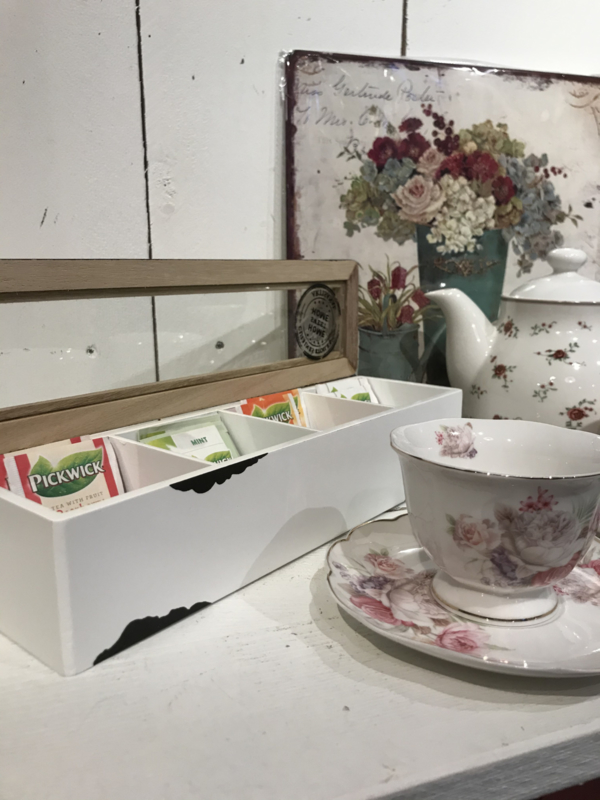 Handige 4-vaks theedoos in een brocante look. De theedoos heeft een glazen deksel met rondom houtkleur en een opdruk met de tekst 'Home sweet Home'