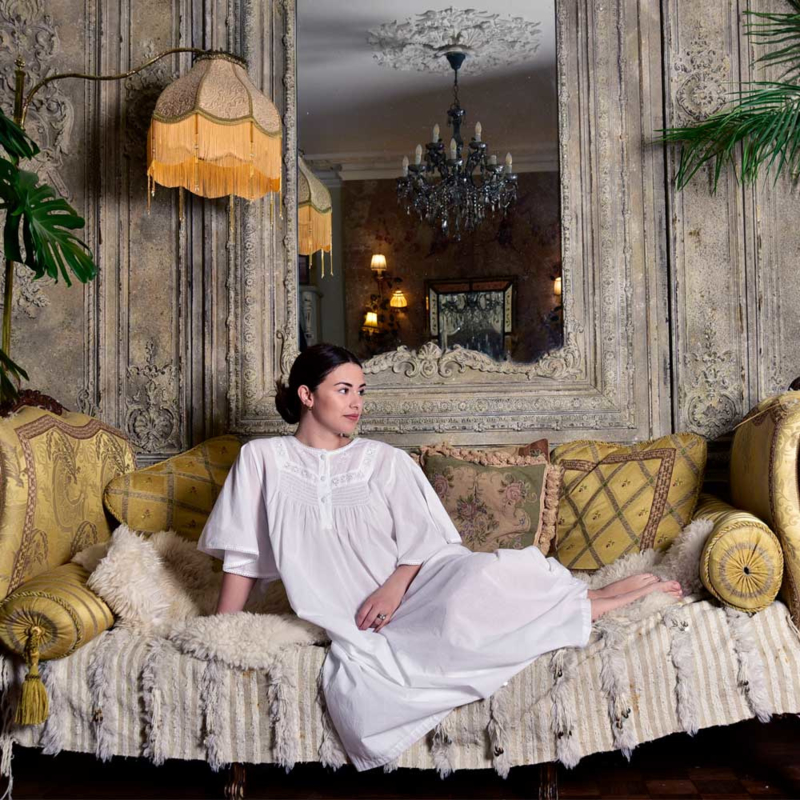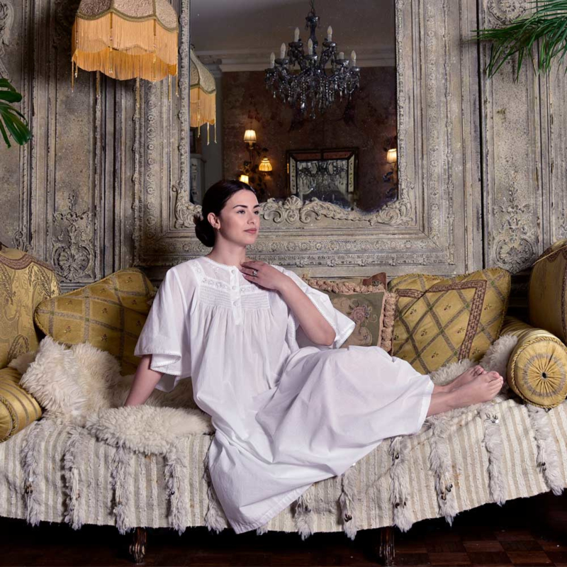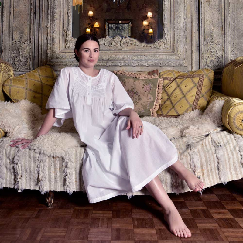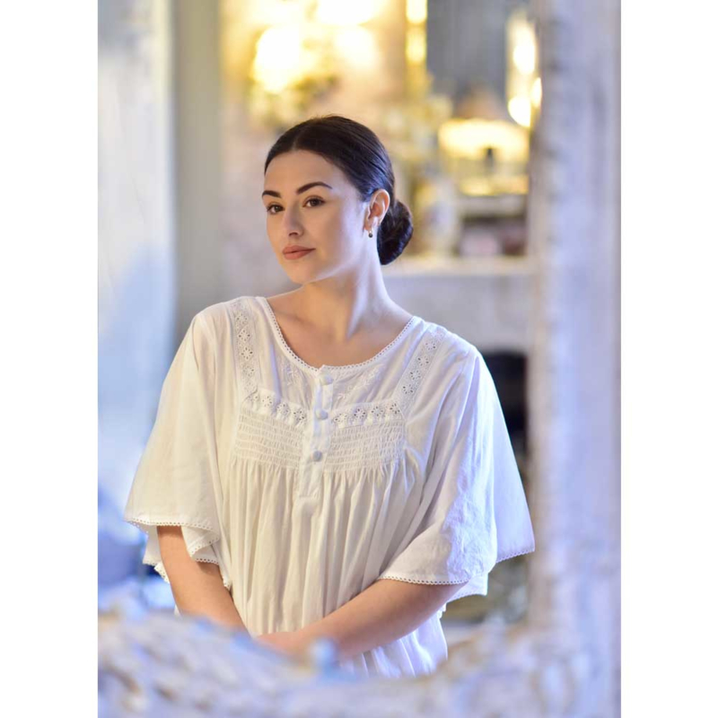 Flatterend en comfortabel volledig wit nachthemd van soepel, lichtgewicht katoen. Deze stijl heeft losse driekwartcirkelmouwen en een ronde halslijn met een smalle lussenrand. Het lijfje opent met beklede knopen en is mooi versierd met smokwerk, ingezette banden van broderie anglaise en witte geborduurde bloemen. Volheid in het nachthemd wordt bereikt met zachte plooien onder het smokwerk op het lijfje en een gerimpeld achterpaneel.