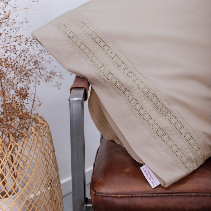 40 cm vanaf de bovenzijde vind je een baan met mooie broderie, de achterkant is glad percal katoen. De sloop heeft dezelfde broderie strook aan de zijkant.