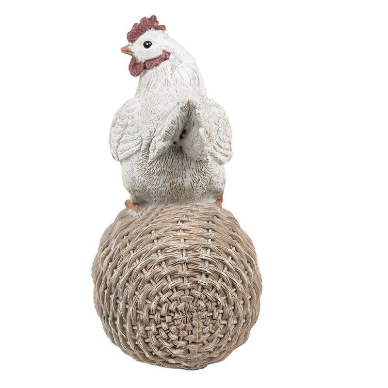 Leuke decoratie van een ei, wat van rotan lijkt met er bovenop een kippetje!