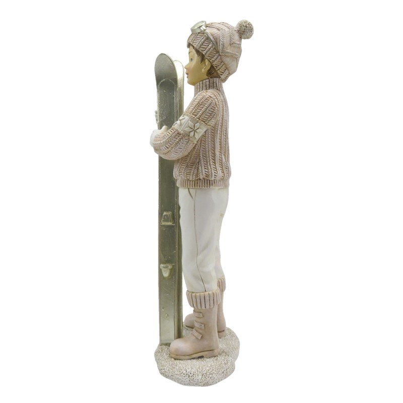 Mooie decoratie van een jongen staand met ski's in wit en zacht roze kleuren!