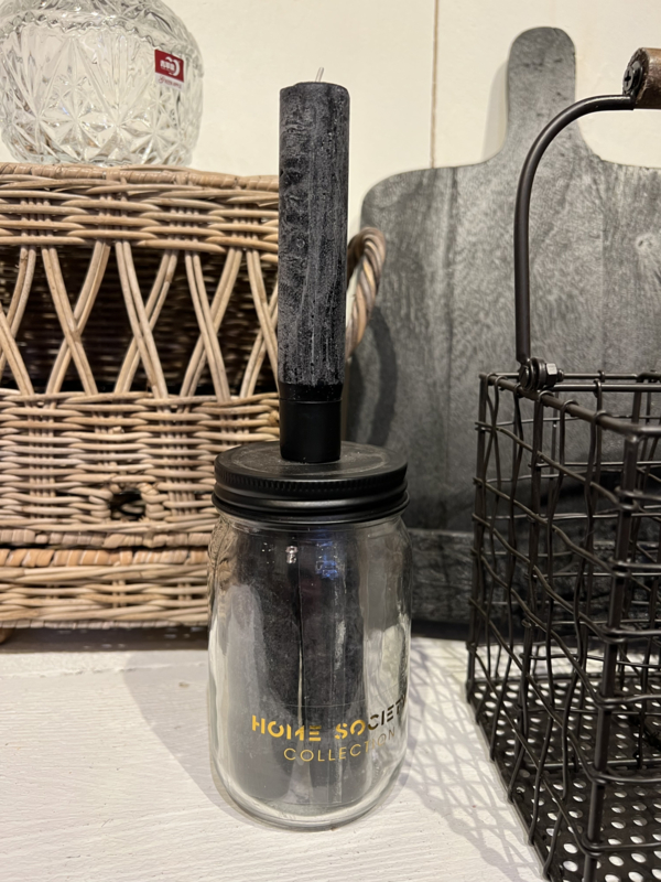 Super leuk deze glazen pot met zwart deksel en 3 kaarsen in zwart. De kaarsen kun je op het deksel zetten en zo als kandelaar gebruiken, gezellig!