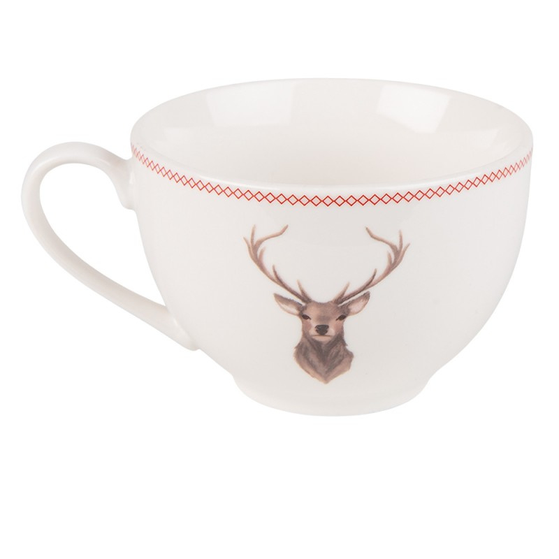 Ook zeer geschikt voor de kerstdagen dit mooie porseleinen servies met een print van een hertenkop met prachtig gewei! De kleur is beige met een bruine hertenkop en als afwerking vind je een klein schuin ruitje in het rood.