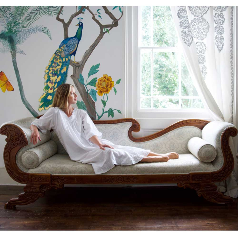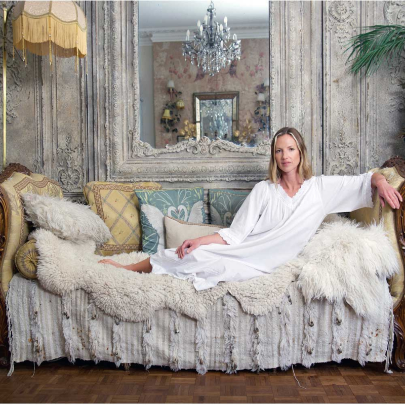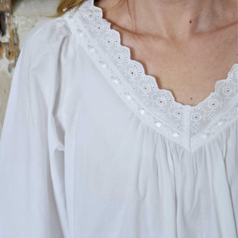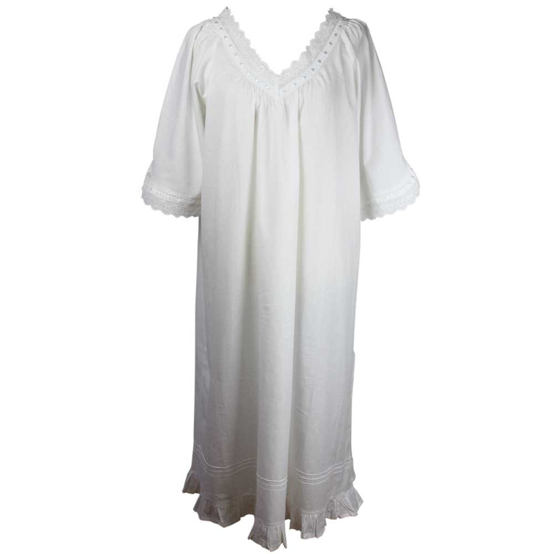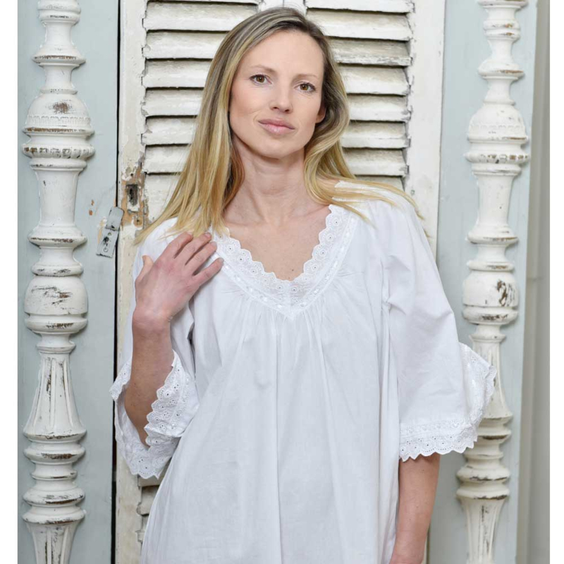 Sarah heet dit elegant mooi wit nachthemd van gladde katoen. Hert nachthemd is ontworpen met een flatterende V-halslijn en driekwarts mouwen. Aan de V-halslijn is het nachthemd gerimpeld en heeft daardoor een wijdere rok en is dan ook perfect voor een comfortabele nachtrust. Mooie details zijn onder meer de kanten boorden rond de halslijn en manchetten waar een satijnen bandje doorheen zit. Verder wat plooitjes boven de zoom en een mooie ruche onder aan de zoom.