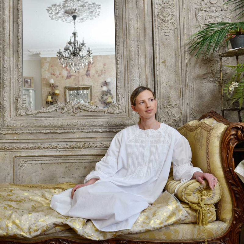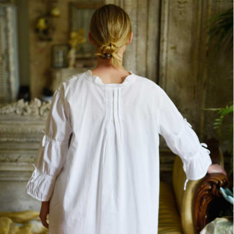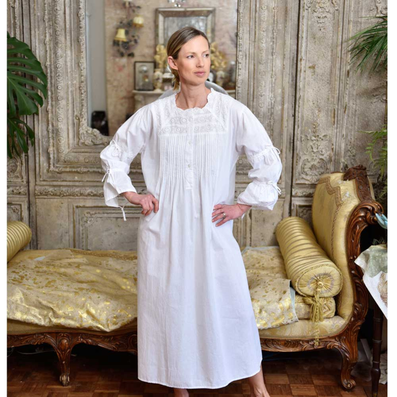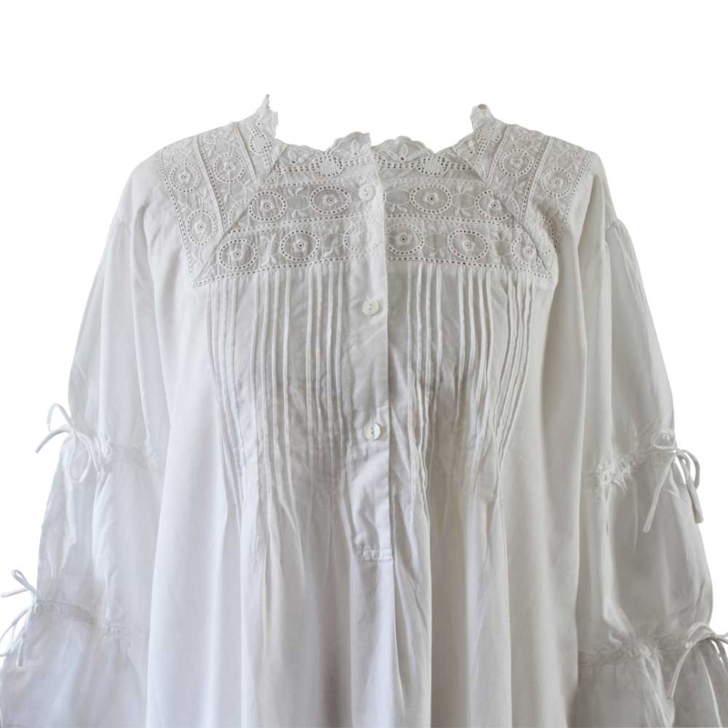 Dit prachtige lange nachthemd van zacht wit katoen is uiterst comfortabel en flatterend. Het heeft een hoge vierkante halslijn omlijst met banden van broderie anglaise kant en een opening met drie knopen. Er lopen fijne rijen biezen langs de buste die leiden naar volledige plooien in de rok die tot halverwege de kuit reikt. De mouwen zijn over de volledige lengte met decoratieve banden van kant en linten. Ook aan de achterkant bevinden zich enkele biezen.