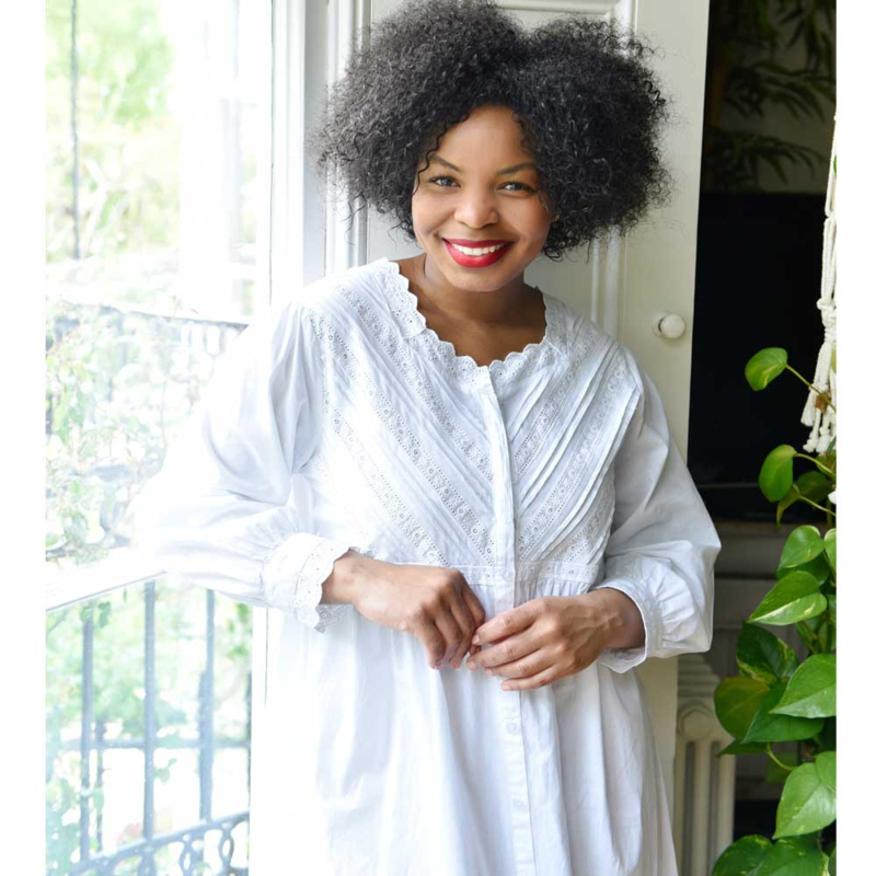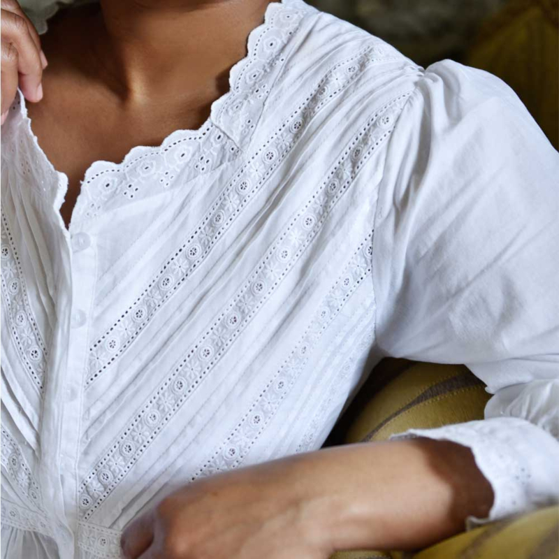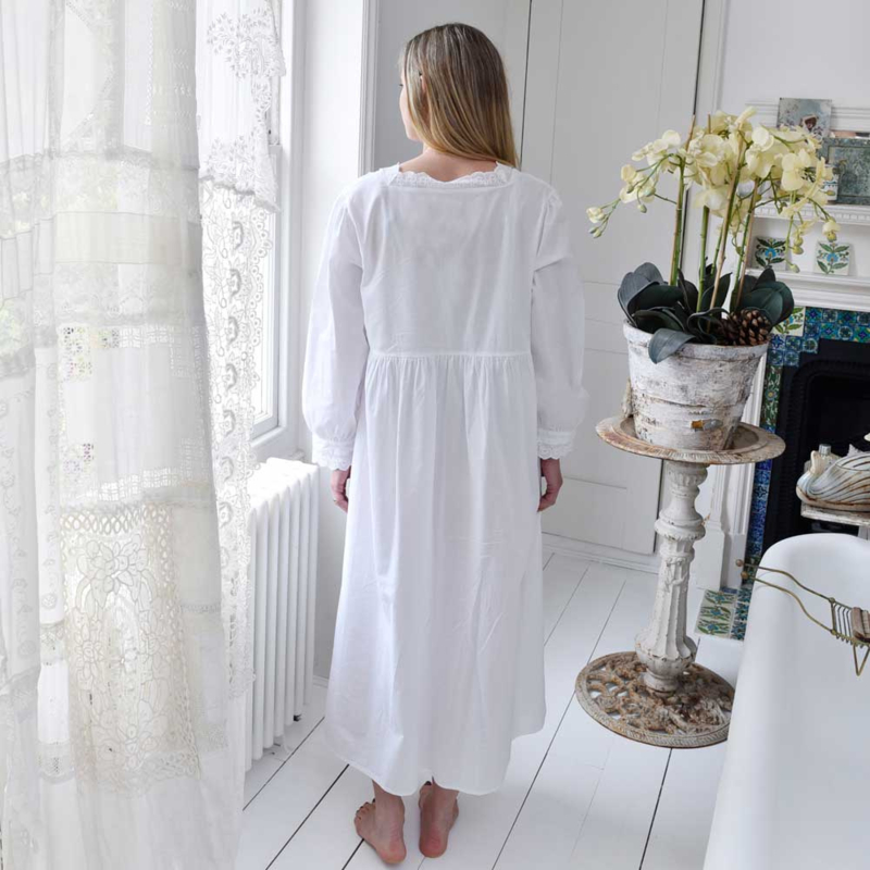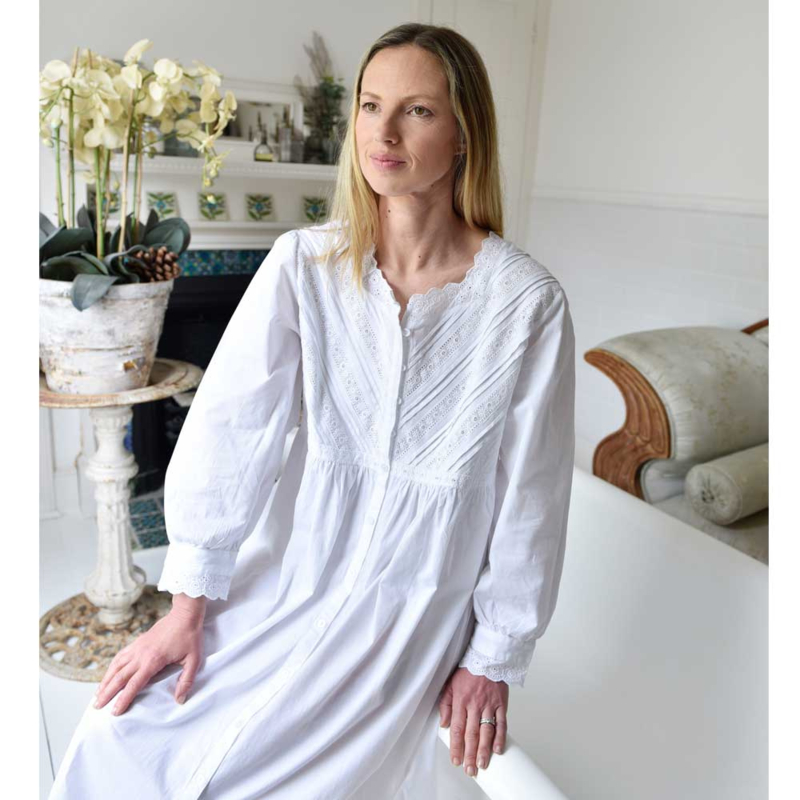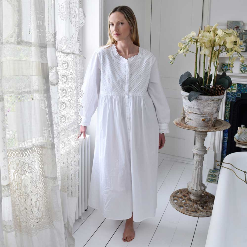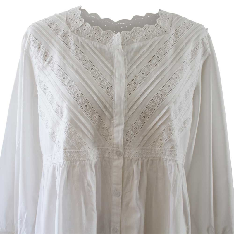 Dit mooie subtiel versierde romantisch nachthemd heeft een knoopsluiting vanaf de halslijn tot aan de zoom dus kan eventueel ook als kamerjas diens doen. Het model met lange mouwen heeft een ronde halslijn, afgezet met de geschulpte rand van witte broderie anglaise kant. Het lijfje is uiterst gedetailleerd met diagonale banden van broderie anglaise kant en plooitjes vanaf de schouders tot aan de tailleband. De manchetten van de mouwen zijn ook afgewerkt met mooie kant.