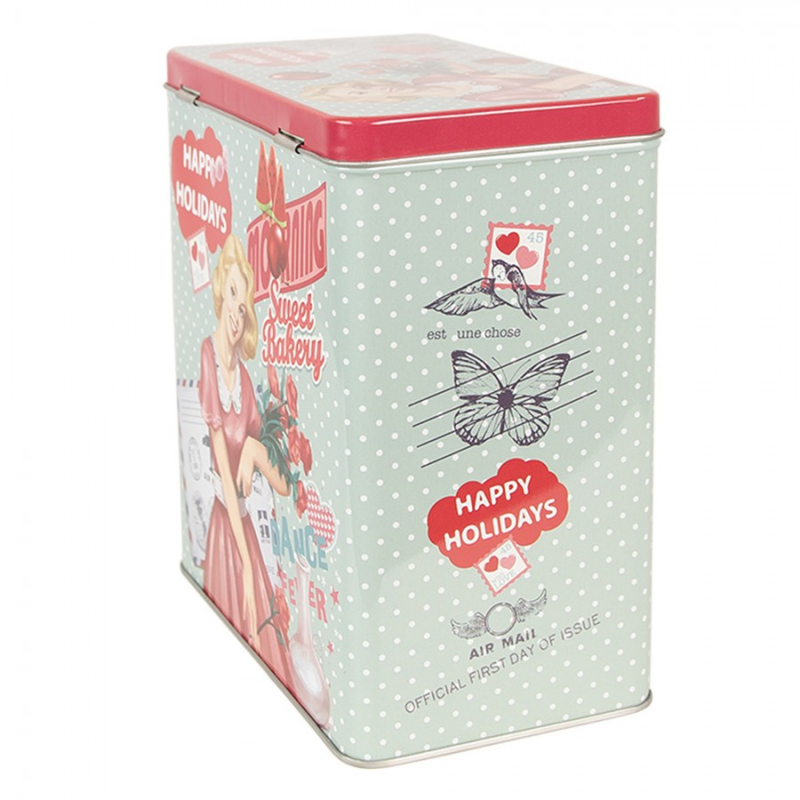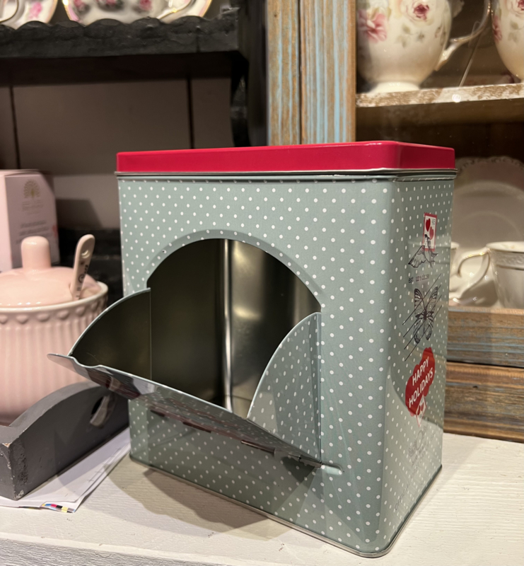 Mooi blik met een nostalgische uitstraling, handig in gebruik maar ook zeker decoratief in de landelijke keuken! Het blik kan ook aan de voorkant met een klep open en zou je er koekjes in kunnen doen en het als koekjestrommel kunnen gebruiken.