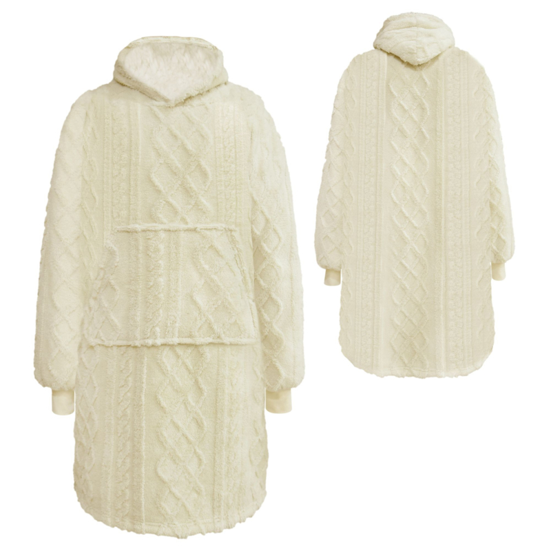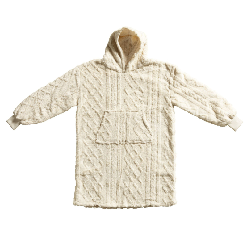 Deze oversized hoodie deken heeft een ingebreid kabel patroon aan de buitenkant en is voorzien van een zachte sherpa stof aan de binnenkant. Kortom hoodie deken Sophie, oftewel Snuggie Sophie is dé perfecte outfit voor een stijlvol avondje relaxen.
