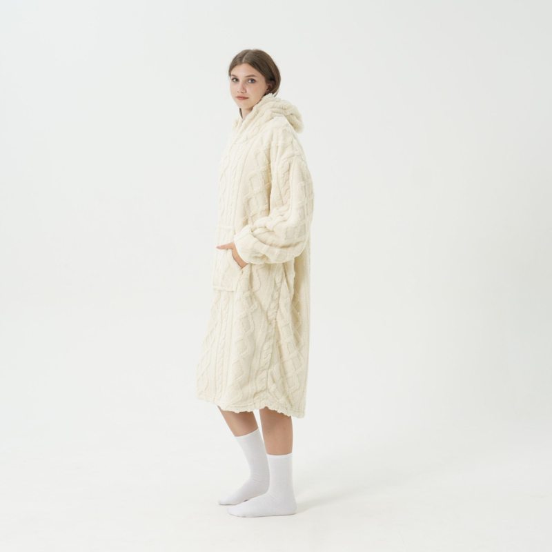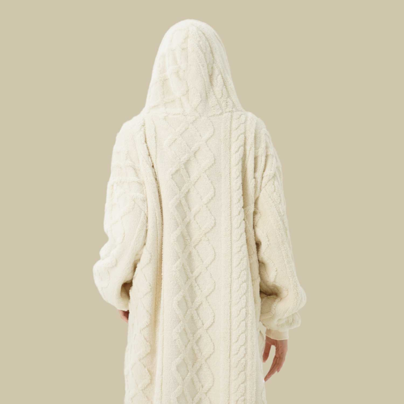 Deze heerlijke hoodie deken Sophie - is dé oplossing voor als je op zoek bent naar een lekker warme fleece deken met mouwen en kabeltrui in één. Deze zachte snuggle hoodie (knuffeltrui) trek je eenvoudig aan. Het luxe ingebreide kabelpatroon zorgt ervoor dat je het niet alleen lekker warm hebt op de bank, maar ook dat je stijlvol door huis kunt lopen zonder het koud te krijgen. De mouwen zijn mooi afgewerkt met een boord, zodat ze niet in de weg zitten.