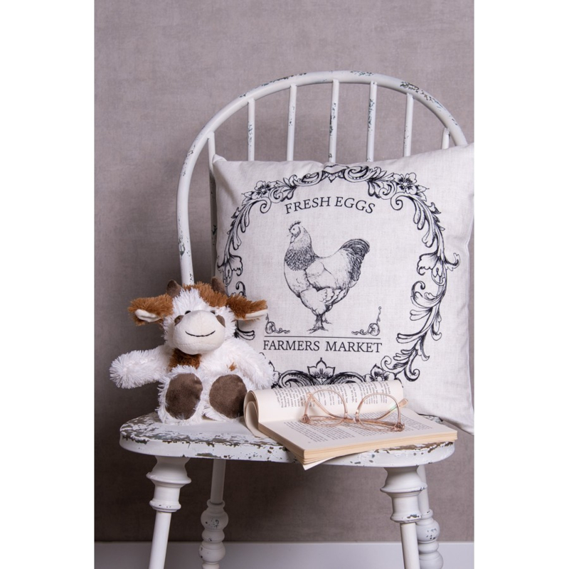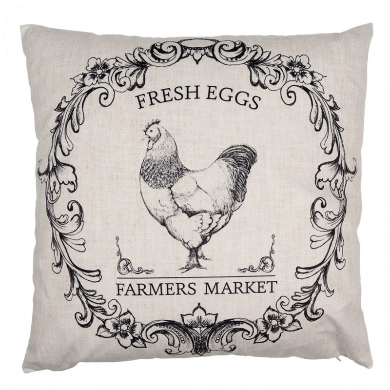Leuke kussenhoes in een landelijke stijl! Op de kussenhoes vind je een afbeelding van een kip en de tekst 'Fresh Eggs Farmers Market' Daar om heen zie je een mooi motief met bladeren en bloemen.