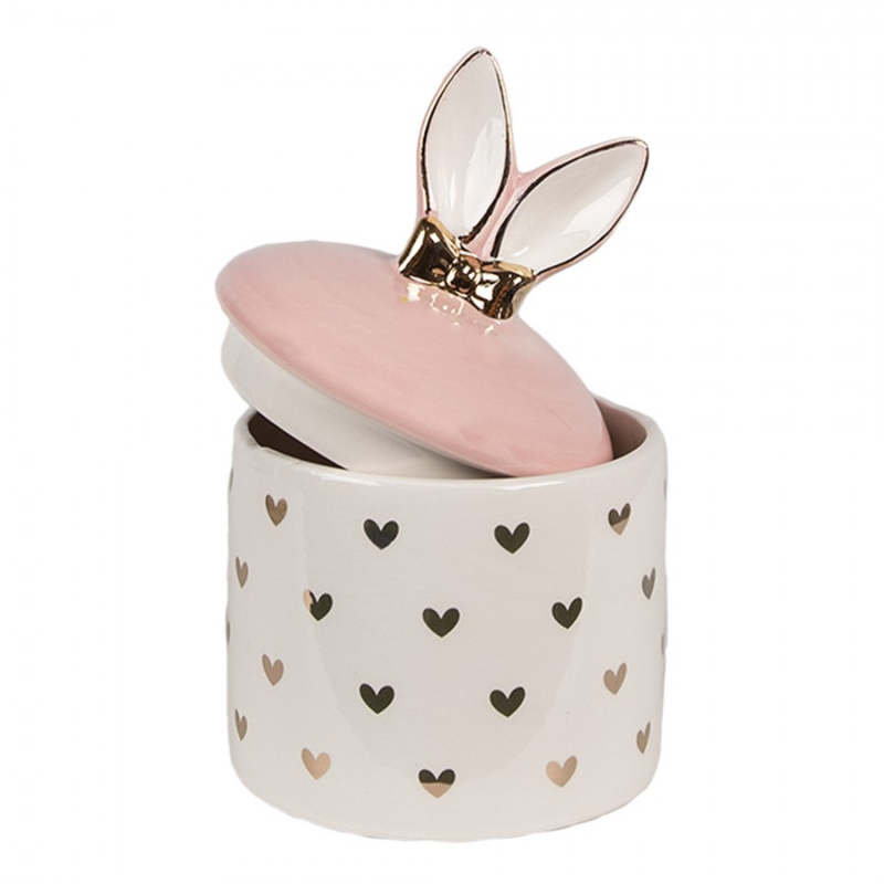 Prachtig potje om bv snoepjes of paaseitjes te bewaren. Het witte potje is voorzien van goudkleurige hartjes en het roze deksel heeft 2 schattige konijnen oren met een goudkleurig strikje.