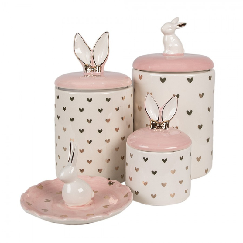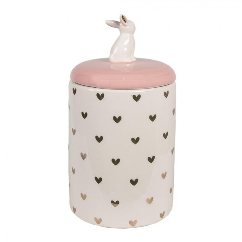 Prachtige voorraad/bewaarpot met goed afsluitend deksel om bv snoepjes, paaseitjes of andere etenswaar te bewaren. De witte pot is voorzien van goudkleurige hartjes en op het roze deksel zit een schattig konijntje met goudkleurige oortjes.