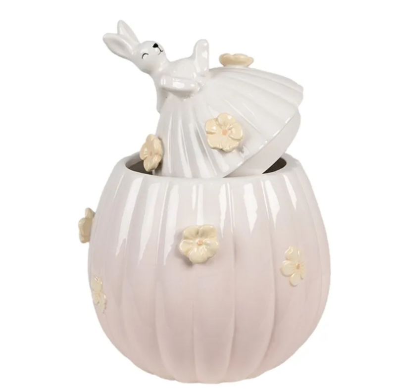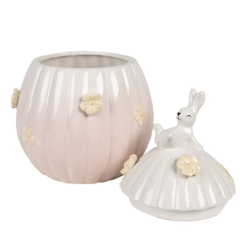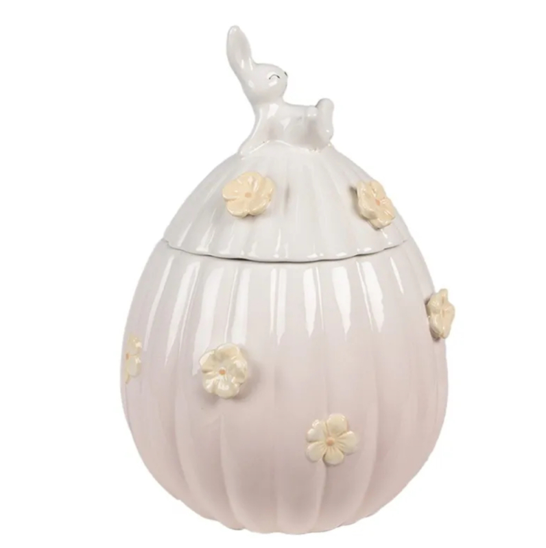 Prachtige voorraadpot in de vorm van een ei. Bovenop het deksel bevind zich een schattig liggend konijntje. De pot is pastelroze van kleur en voorzien van pastel gele bloemen!