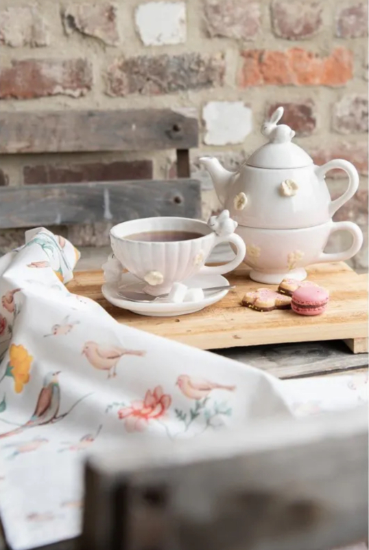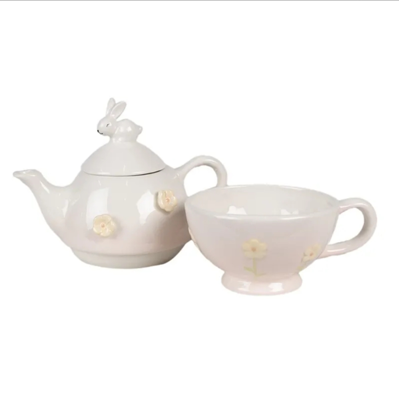 Prachtige eenpersoons theepotje in een mooie overlopende pastelroze kleur. Bovenop het deksel bevind zich een schattig liggend konijntje. De tea for one is voorzien van mooie pastel gele bloemen.