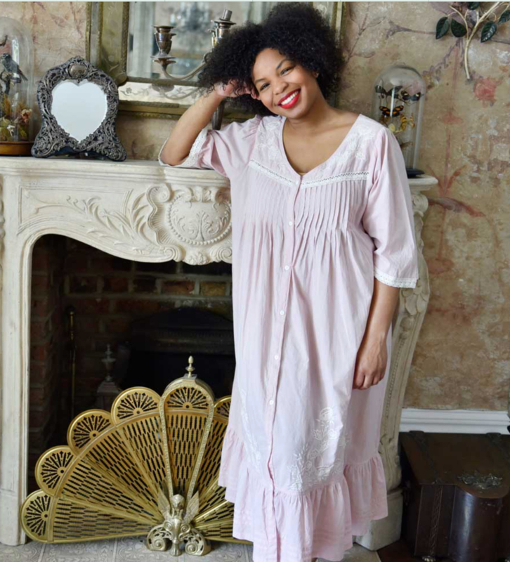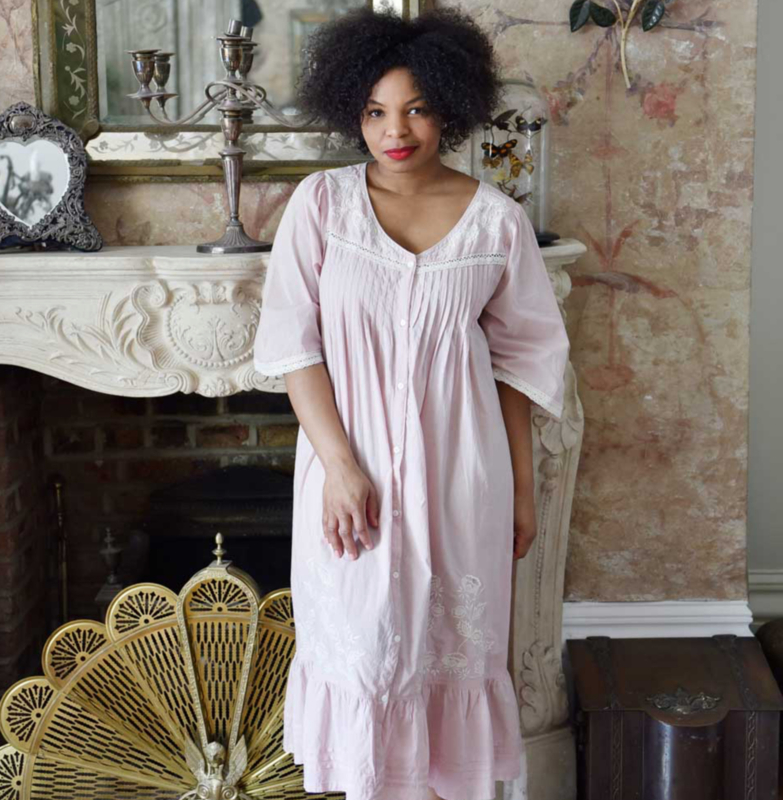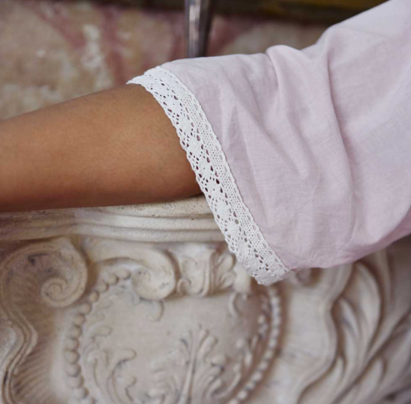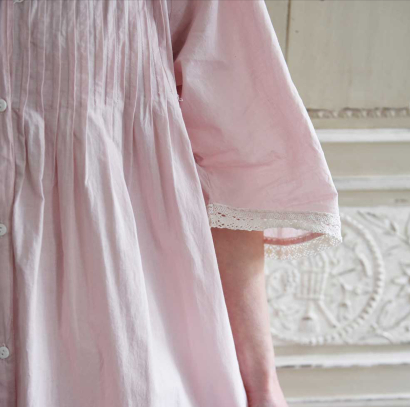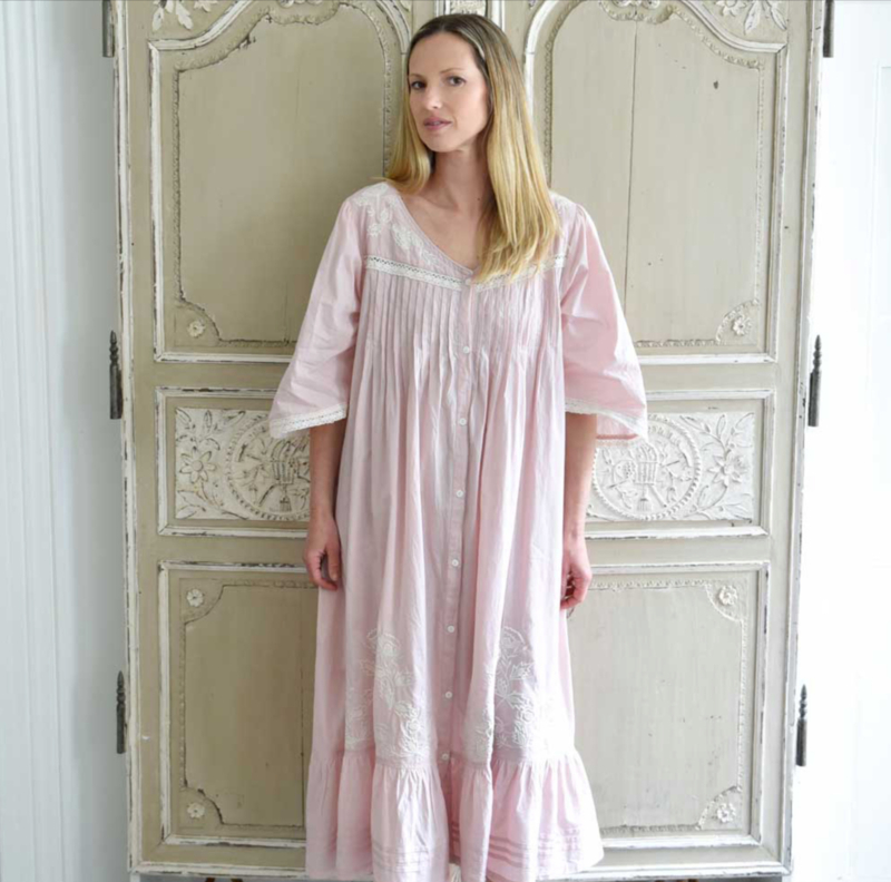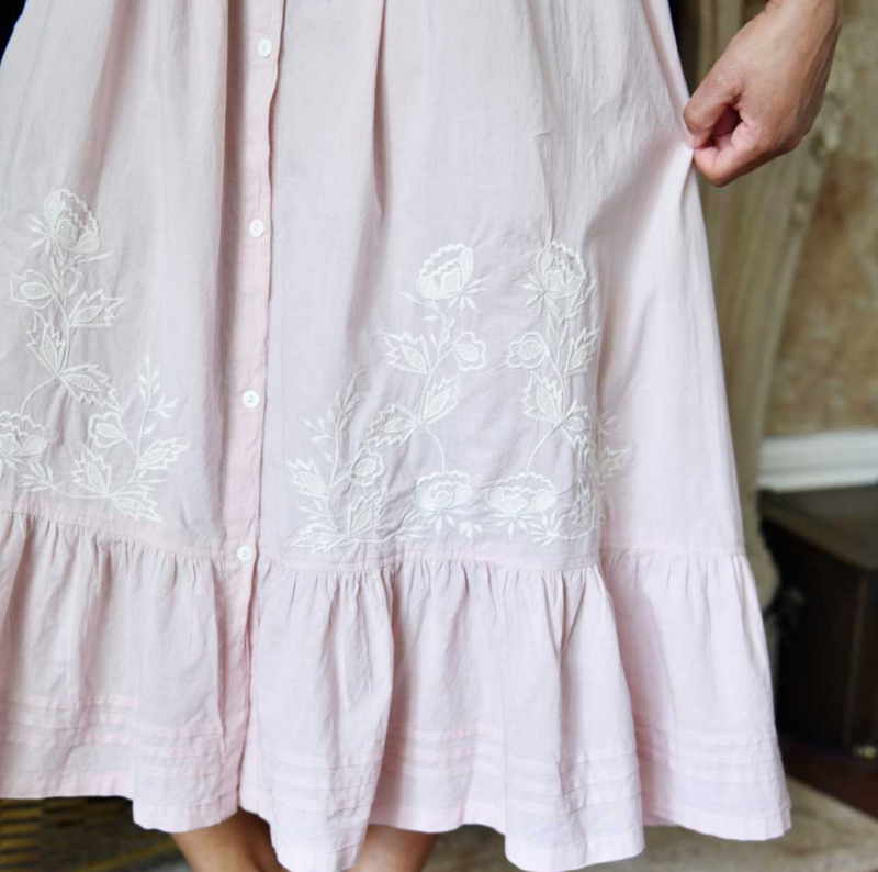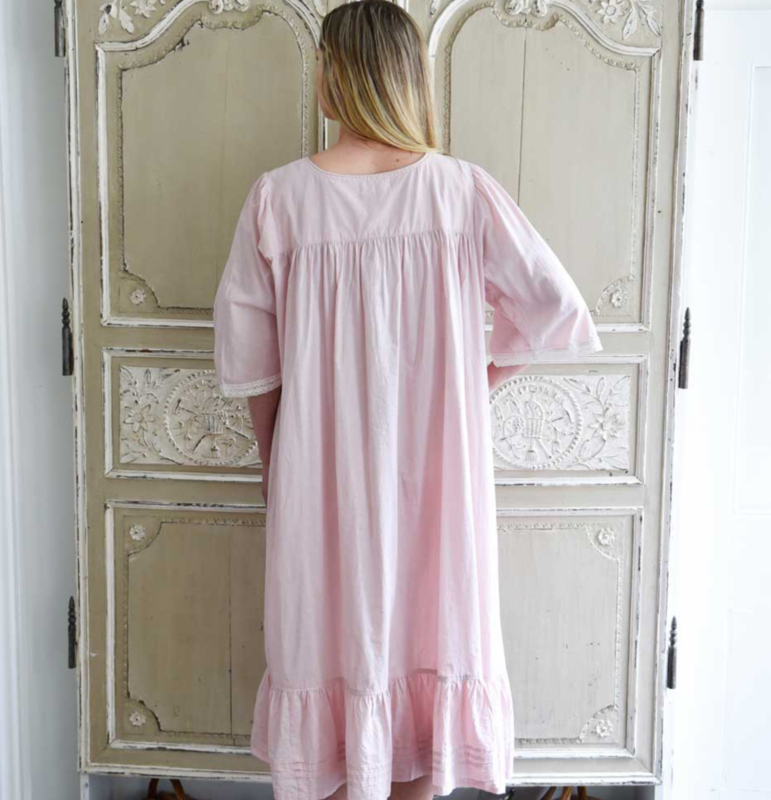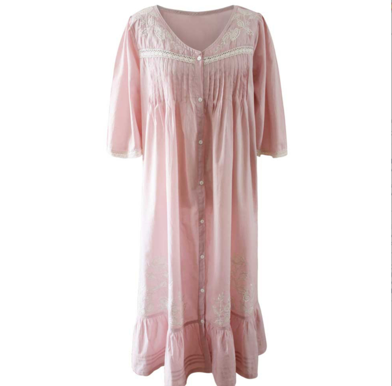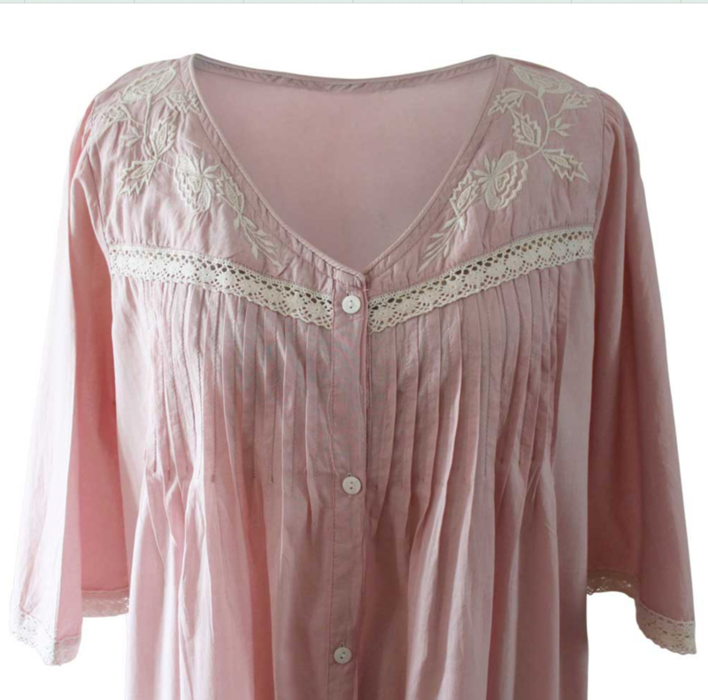 Prachtig katoenen nachthemd in een mooie zachtroze kleur. Het nachthemd heeft 3/4 mouwen en een doorknoopsluiting met kleine parelmoerknoopjes. De mouwen zijn afgewerkt met een mooie kant. Het voorpand heeft een aparte V halslijn en is voorzien van kleine plooitjes daarom valt dit model wat ruimer vanaf de borstwijdte. Aan de onderkant zit een brede ruche met plooitjes. Over het gehele nachthemd bevinden zich mooie borduursels.
