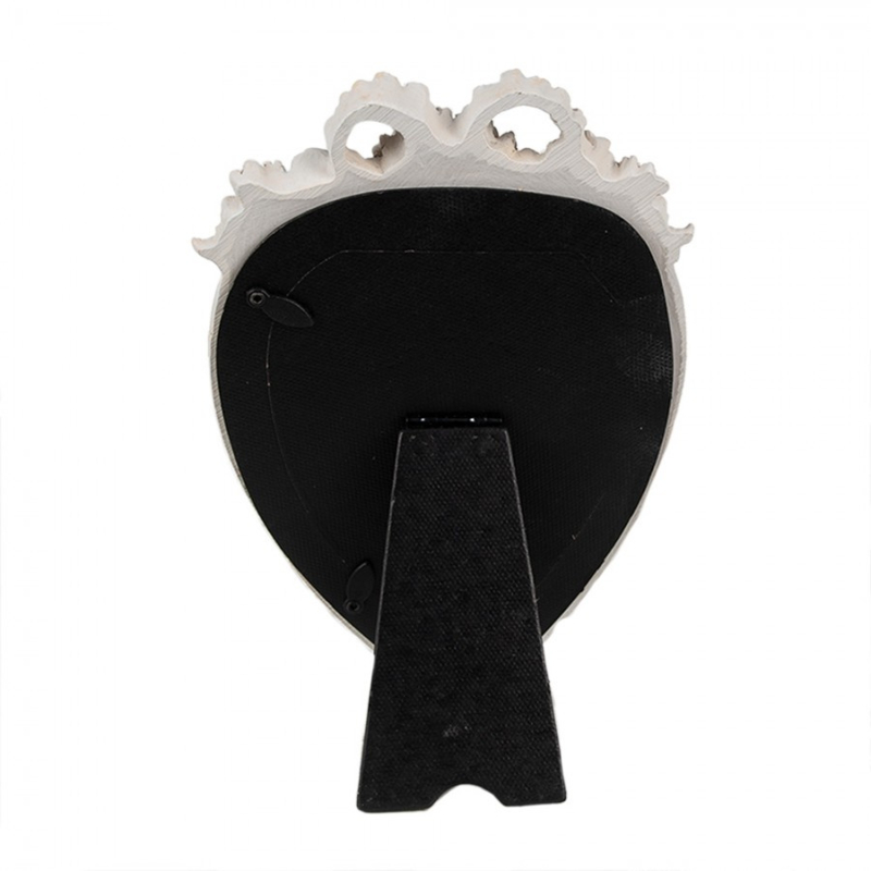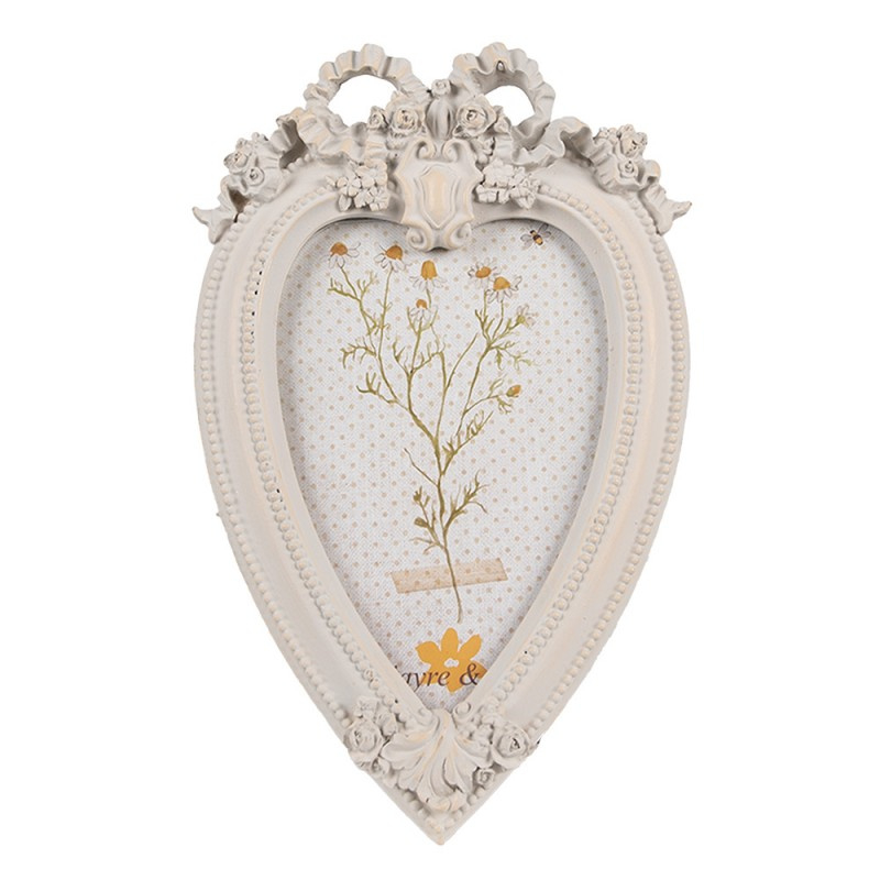 Romantische decoratieve fotolijst in een hartvorm en met mooie versierselen op de rand en bovenkant. De kleur is wit, geen spierwit beetje ouder gemaakt.