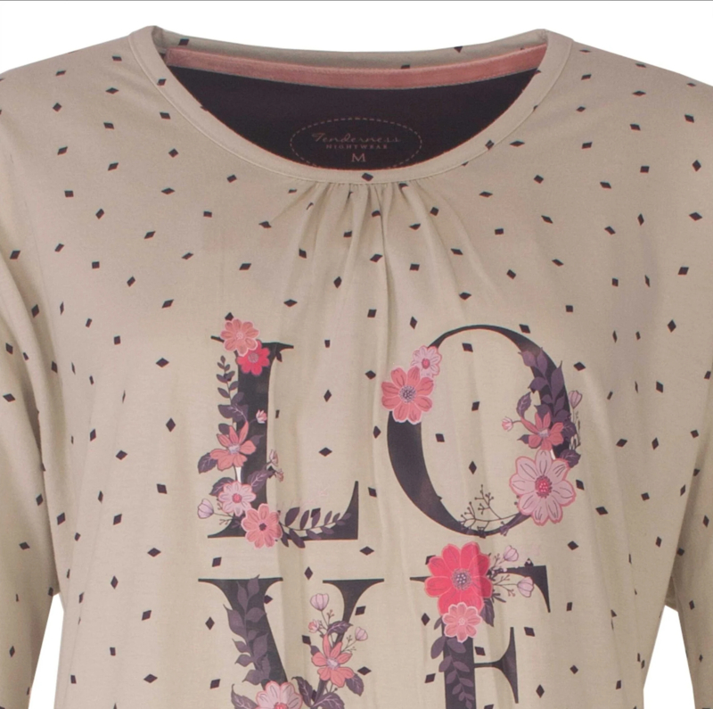 Dit comfortabel nachthemd LOVE van het merk Tenderness staat voor kwaliteit en comfort. De beige ondergrond heeft een geprint wybertjes dessin in een paarse kleur. Op de paarse letters LOVE vind je vrolijke bloemen in roze tinten.