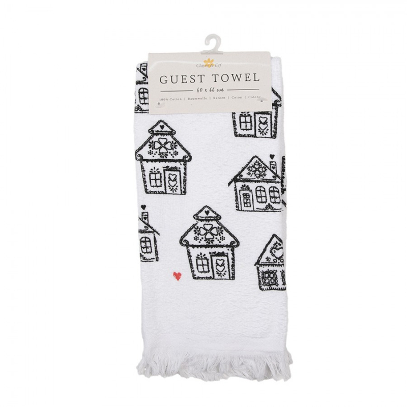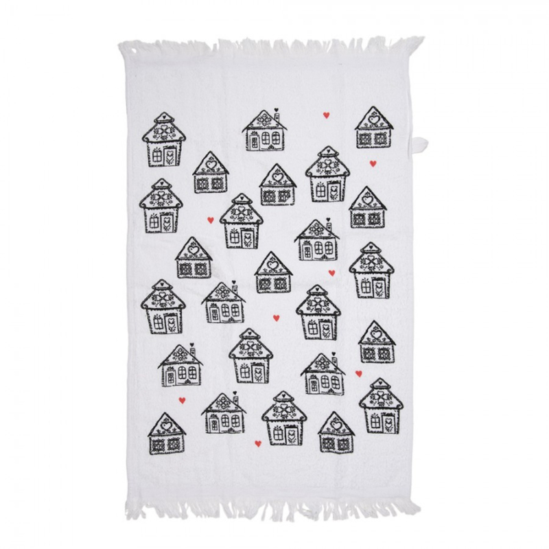 Dit wit met zwart gastendoekje zal zeker gezelligheid brengen aan je badkamer of toilet! Het gastendoekje heeft leuke huisjes als motief met af en toe een klein rood hartje.