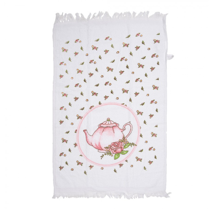 Zo gezellig voor op badkamer of toilet dit leuke gastendoekje met de afbeelding van een roze theepot in een cirkel en daarom heen kleine schattige bloemetjes