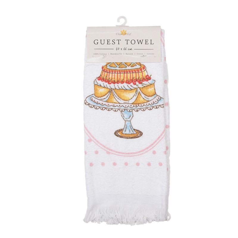 Zo gezellig voor op badkamer of toilet dit leuke gastendoekje met de afbeelding van een feestelijke taart in een roze cirkel en daarom heen roze stippen.