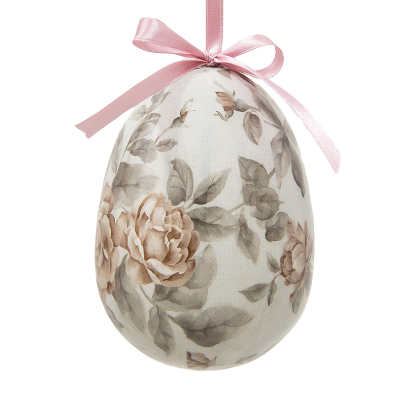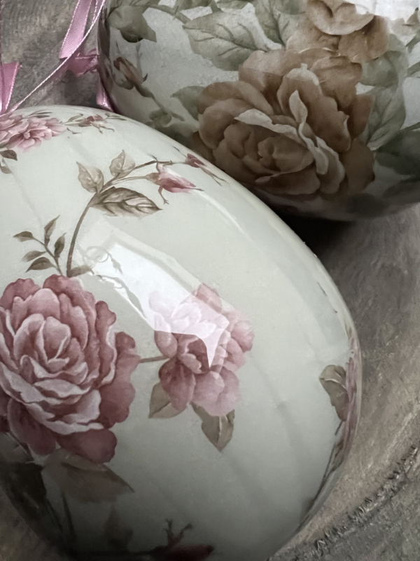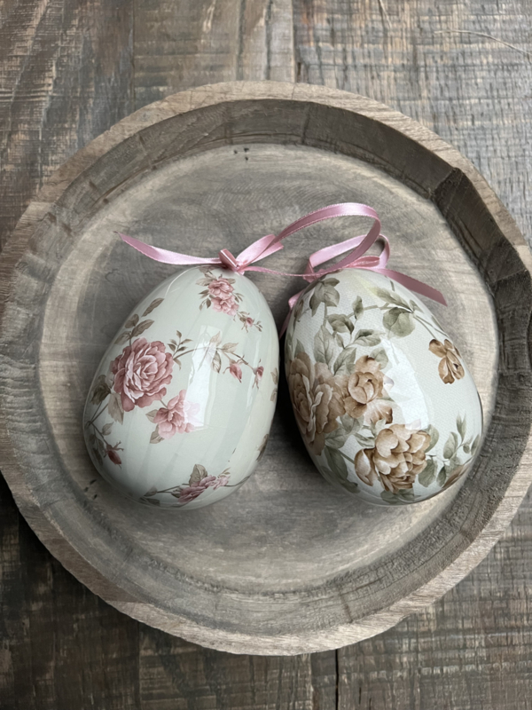 Een set van 2 prachtige, originele paashangers in de vorm van eieren. Versierd met kleurrijke prints van bloemen, perfect als decoratie voor paastakken.