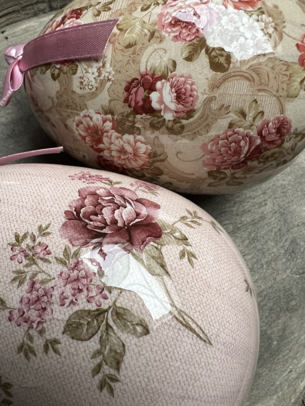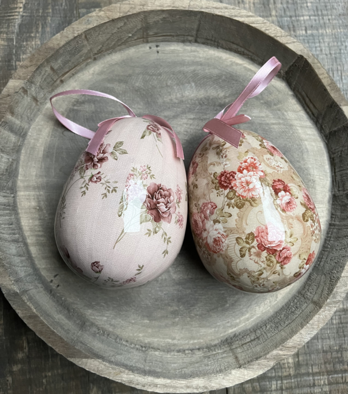 Een set van 2 prachtige, originele paashangers in de vorm van eieren. Versierd met kleurrijke prints van bloemen, perfect als decoratie voor paastakken.