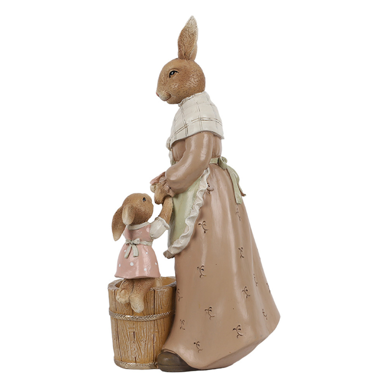 Een schattige decoratie deze moeder konijn met sjaal en schort staand bij een 'houten' emmer met daarop een klein meisjes konijntje. In de emmer kan eventueel nog een klein plantje ingezet worden of vullen met paaseitjes.