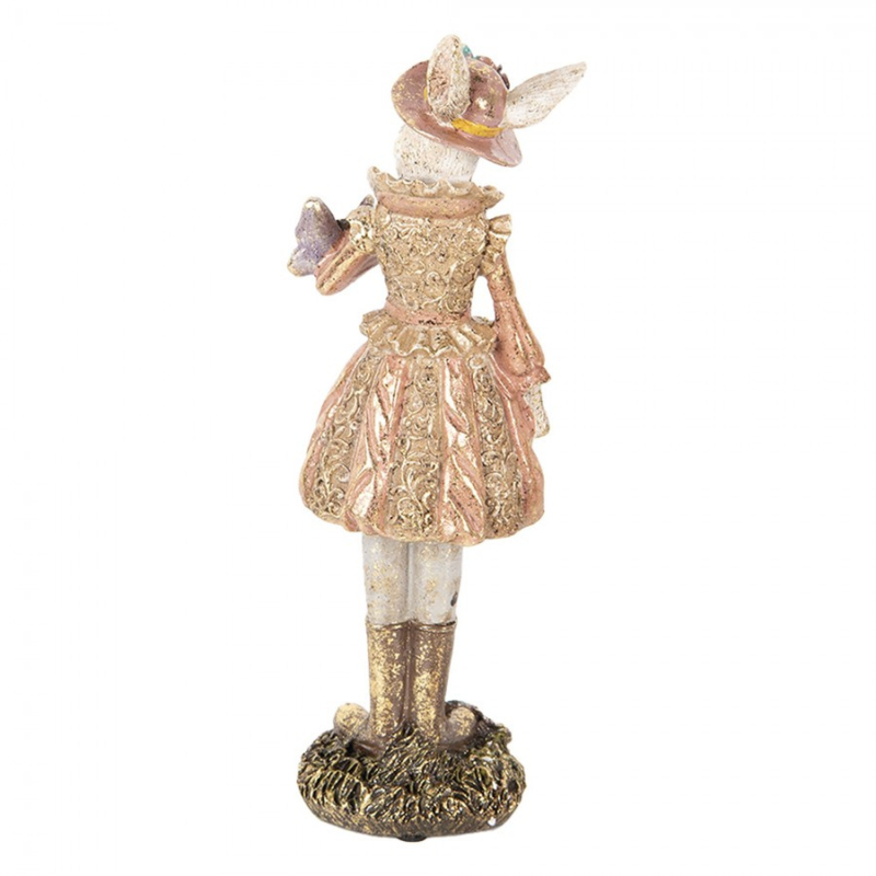 Een prachtige decoratie van deze vrouwelijke konijn met een mooie jurk aan en een hoedje op. Ook vind je een vlinder en bloemetjes. Het beeldje is afgewerkt met een gouden finish.