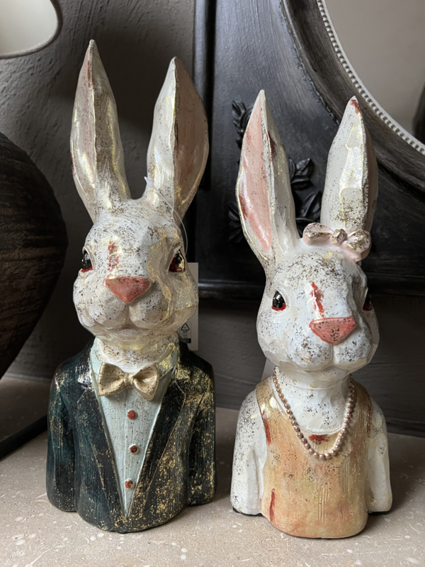 Super mooie decoratie voor op een kastje of wandplank deze mevrouw konijn met een goudkleurig jurkje, kettinkje en strikje. Het geheel is afgewerkt met een goudkleurige finish!