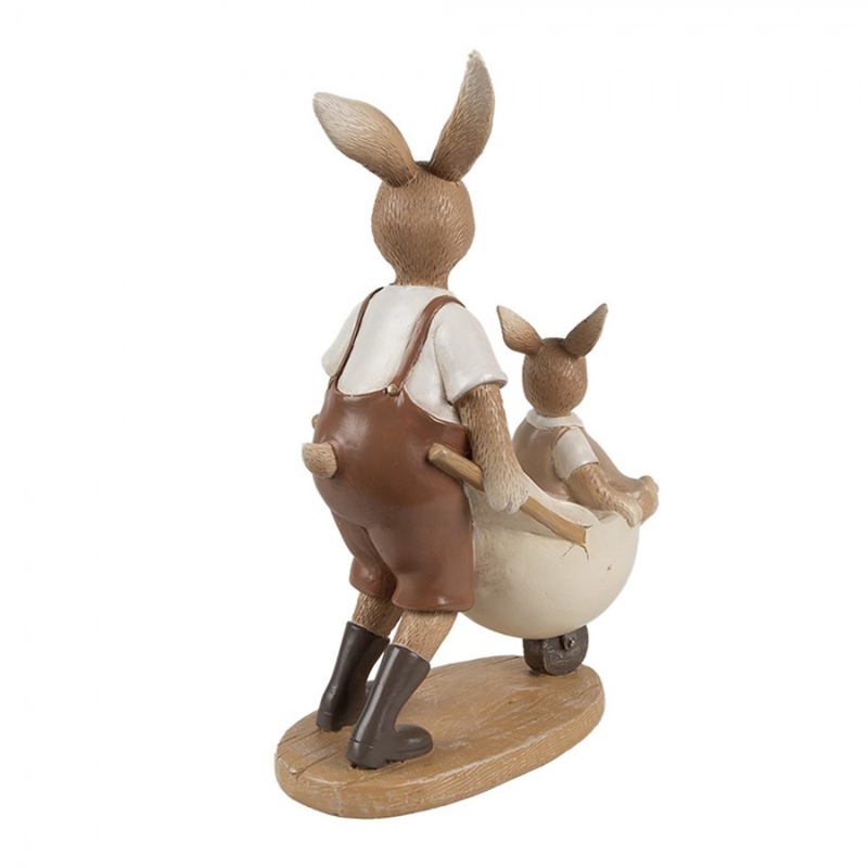 Wat een schattige en gezellige decoratie van dit papa konijn met een kruiwagen in de vorm van een ei. In het ei bevind zich een klein meisje konijntje met een roze jurkje aan.
