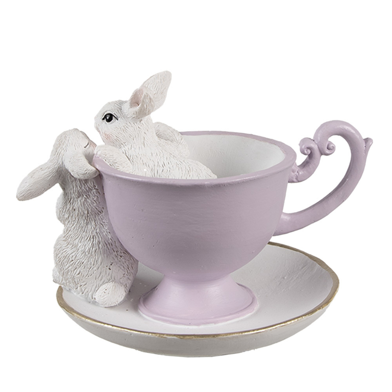 Schattige decoratie van een kop en schotel in een lila kleur en er bevinden zich 2 konijntjes waarvan 1 konijntje een roosje vasthoudt.