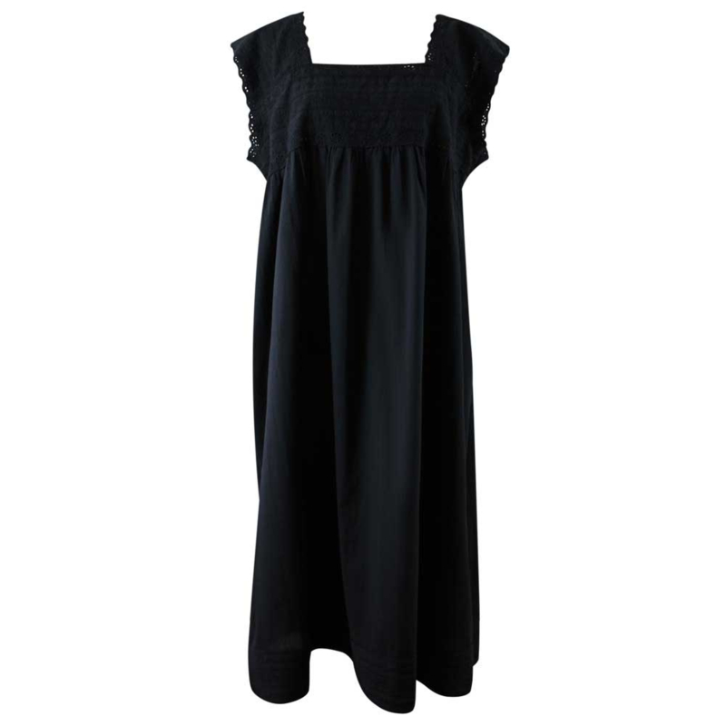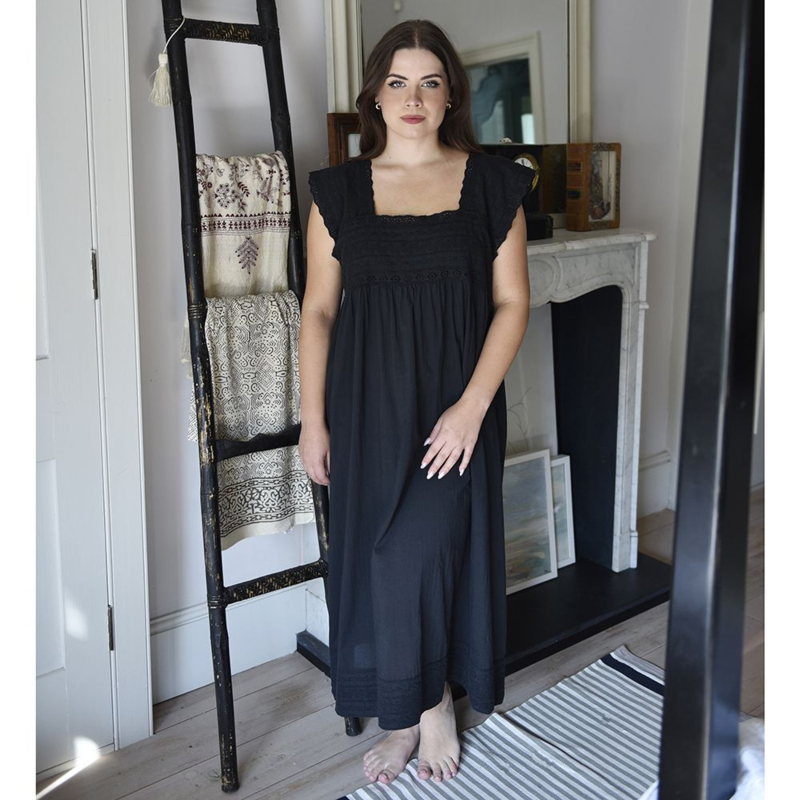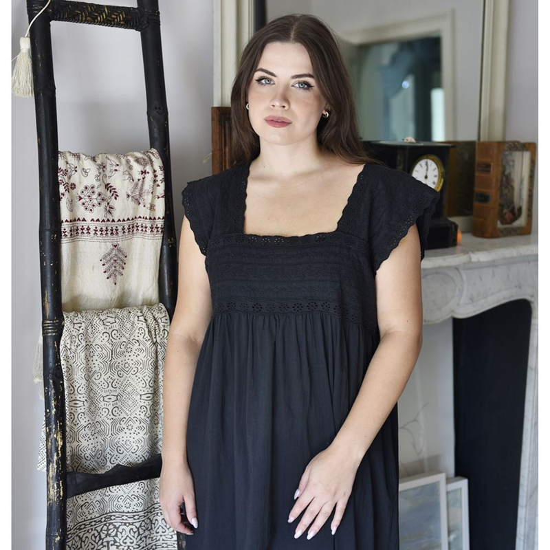 Ook prachtig de zwarte versie van nachthemd Pearl! Het is een zeer mooie nachtjapon die tot halverwege de kuit valt en een flatterende vierkante halslijn heeft, die aan de achterkant iets lager is gesneden. Het lijfje en de korte mouwen zijn van geborduurd katoen met ajourwerk dat is afgezet met Broderie Anglaise en de zoom heeft nog een band met prachtig borduurwerk.