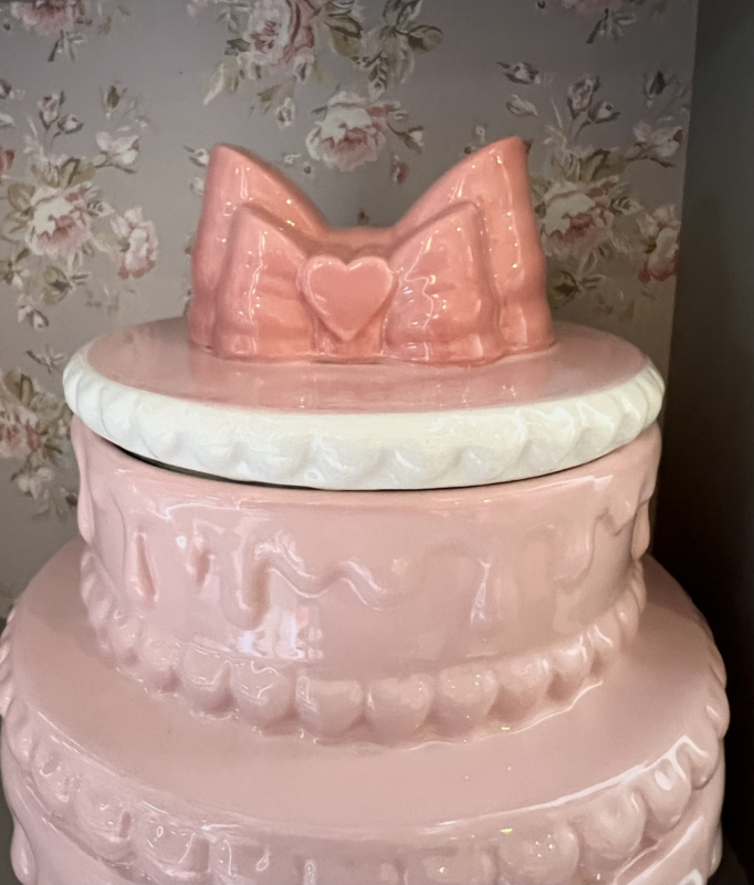Een leuke charmante voorraadpot in een pastelroze kleur afgewerkt met een mooie strik op het deksel. Perfect voor het stijlvol opbergen van kleine spulletjes.